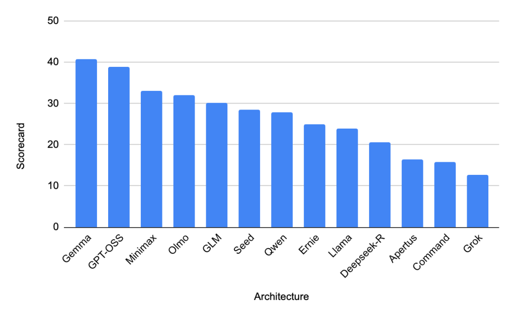 • Efficiency/Scale: Decile ranking (1-10) of tokens per second per billion parameters.